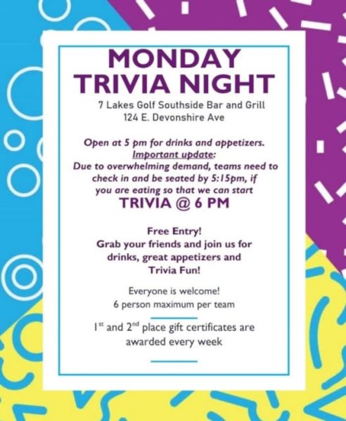The Southside Bar and Grill at 7 Lakes Golf Club hosts Monday Night Trivia beginning at 6pm. Entry is free to play. Due to overwhelming demand, teams need to check in and be seated by 5:15pm. Everyone is welcome! 6 person maximum per team. 1st and 2nd place gift certificates awarded each week.