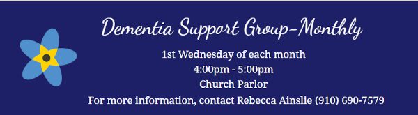 A Monthly Dementia Support Group meets on the first Wednesday of each month from 4:00PM-5:00PM in the Church Parlor at the Community Presbyterian Church in Pinehurst. This group provides a consistent space for community members to connect and find support. For further details, interested individuals can reach out to Rebecca Ainslie at 910-690-7579. For more details, CLICK HERE.