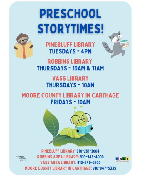 The Moore County Library in Carthage hosts a Pre-School Storytime each Friday at 10:00am. Join the fun! For additional information, call 910-947-5335.