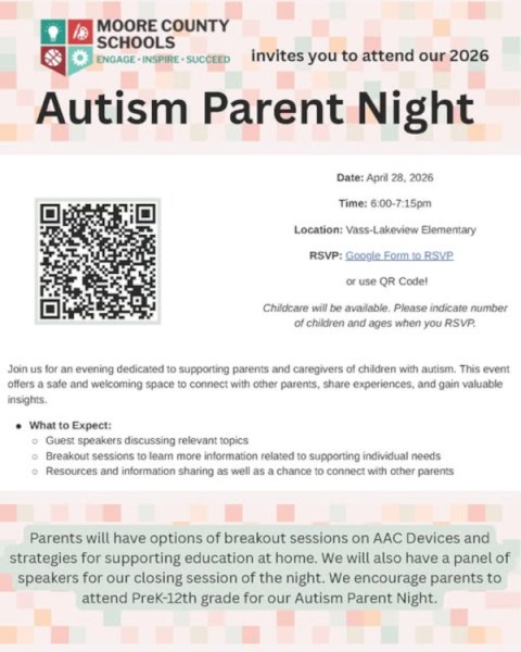 Save the Date: Autism Parent Night-Moore County Schools’ Exceptional Children’s Department invites all parents and caregivers to attend Autism Parent Night on Tuesday, April 28th at 6:00PM at Vass-Lakeview Elementary School.