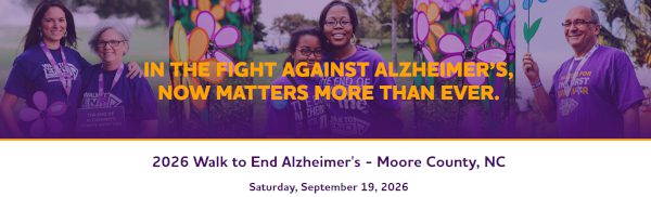 The 2026 Walk to End Alzheimer’s of Moore County takes place on Saturday, September 19th from 9am-12pm! The walk is held at Sandhills Community College.