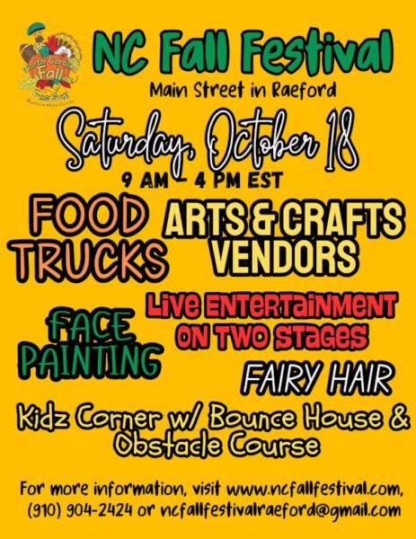 Get ready for a day of fall fun at the NC Fall Festival on Saturday, October 18th in downtown Raeford! From 9am-4pm, Main Street will be filled with over 100 vendors showcasing art, crafts, handmade goods and more from across North Carolina and beyond. Enjoy a variety of food trucks, a cruise in (10am-4pm) live entertainment on two stages and family fun in the Kidz Corner—complete with a bounce house, obstacle course, face painting and fairy hair. Don’t miss this vibrant celebration of community, creativity and fall festivities. Contact ncfallfestivalraeford@gmail.com or (910) 904-2424 with questions. Follow the event website link provided below for additional information.