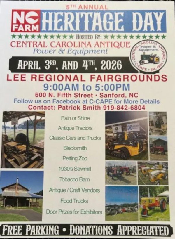 Those who bring their own antique equipment or classic vehicles are eligible for door prizes, and while parking is free, donations are greatly appreciated to support the heritage efforts. Access to the festivities is located at 600 N. Fifth Street in Sanford, and more information can be obtained by contacting Patrick Smith at 919-842-6804.