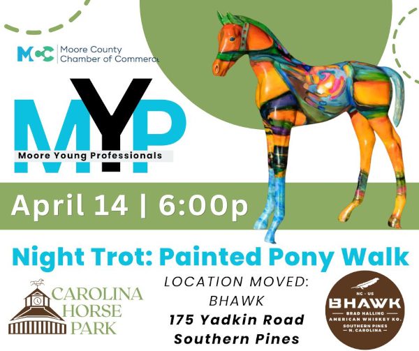 The Moore County Chamber of Commerce and Moore Young Professionals are partnering with Carolina Horse Park for the Night Trot: Painted Pony Walk on Tuesday, April 14th at 6:00PM. Connect with community and appreciate the art. It is a meaningful way to celebrate local impact while enjoying a guided stroll through the heart of the town!
