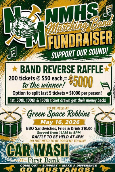 Take part in the Band Reverse Raffle at 4:00PM, where only 200 tickets are being sold for $50.00 each for a chance to win a grand prize of $5,000. Participants have the option to split the prize among the last five tickets for $1,000 each, and those holding the 1st, 50th, 100th, and 150th tickets drawn will get their money back. You do not need to be present to win, so find a band member today to purchase your ticket and help the Mustangs make a difference!