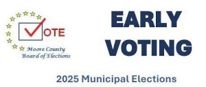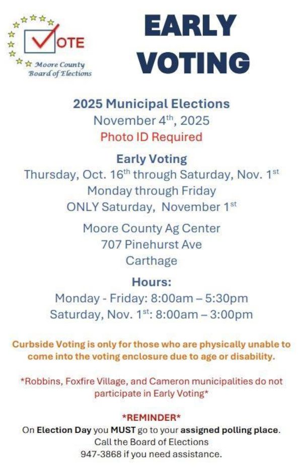 Early voting in Moore County for the 2025 Municipal Elections begins on Thursday, October 16th! Take advantage of One Stop Early Voting at the Moore County Agricultural Center in Carthage or the Aberdeen Recreation Center. A photo ID is required.
