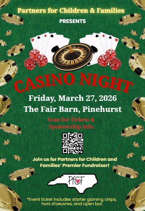 Join Partners for Children & Families for an unforgettable evening of high stakes for a great cause! The 3rd Annual Casino Night Fundraiser on Friday, March 27th from 7pm-10pm at The Fair Barn in Pinehurst. The evening features classic casino-style games, exciting prizes, great food, and even better company—all in support of PFCF’s mission.