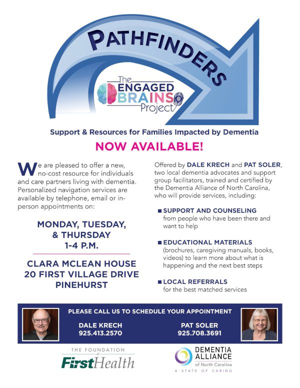 Pathfinders, a new no-cost resource from The Engaged Brains Project, offers support and resources for individuals and caregivers living with dementia. This service is provided by local dementia advocates Dale Krech and Pat Soler, who are trained and certified by the Dementia Alliance of North Carolina.