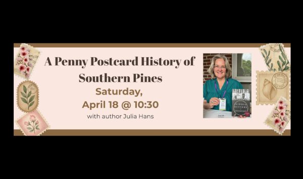 Explore a Penny Postcard History of Southern Pines with local author Julia Hans at the Southern Pines Public Library on Saturday, April 18th, 10:30AM-11:30AM! Hans has assembled nearly 200 vintage postcards unique to Southern Pines. See what life was like at the turn of the 20th century and see the evolution of Broad and Bennett streets through the years. Copies of Hans’ new book will be available for purchase after the event.