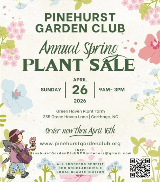 The Pinehurst Garden Club will hold their annual plant sale fundraiser on Sunday, April 26th from 9:00AM- 3:00pm with its streamlined pickup service at the Green Haven Plant Farm located at 255 Green Haven Lane in Carthage. Master gardeners will be available to answer gardening questions and Green Haven greenhouses will be open for day-of-sale purchase of flowers, plants, herbs, and gardening supplies.