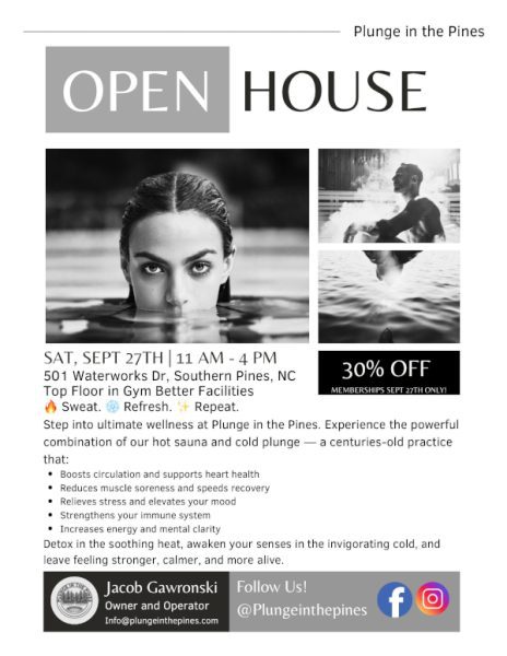 Come check out Plunge in the Pines and experience the incredible benefits of hot sauna and cold plunge therapy at a special Open House event this Saturday, September 27th | 11am-3pm! See the new space, learn more about memberships, and enjoy an exclusive 30% OFF discount if you purchase a membership that day only! Celebrate Gym Better’s Open House. Grab delicious bites, smoothies & coffee from The Frisky Biscuit. Don’t miss out on this fun community event — food, fitness, and wellness all in one place!