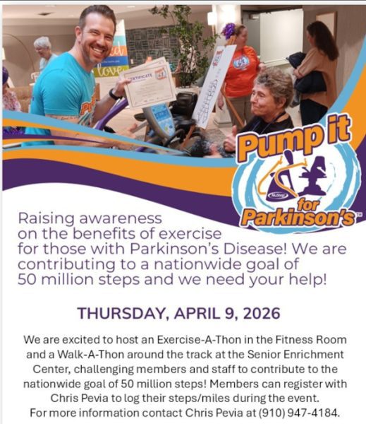 The Moore County Senior Enrichment Center is joining a nationwide effort to combat Parkinson’s disease with its “Pump It for Parkinson’s” event on Thursday, April 9th. Held at the center (8040 NC Highway 15-501 in West End), this community-driven event aims to contribute to a massive national goal of 50 million total steps to raise awareness for the benefits of exercise in managing Parkinson’s symptoms.
