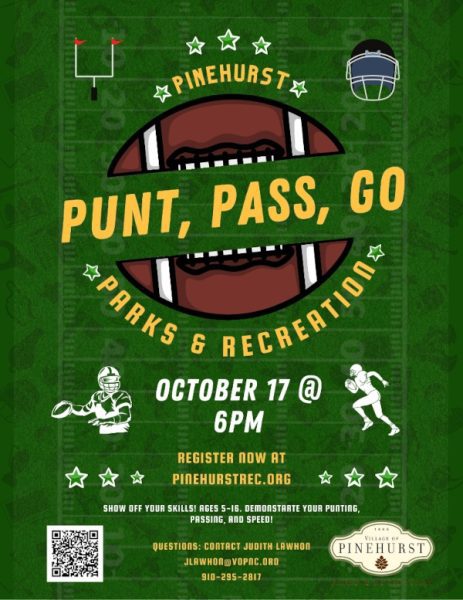 Think you have what it takes to Punt, Pass, & Go? Pinehurst Parks & Recreation invites all football enthusiasts aged 5-16 to show off their speed, accuracy, and arm strength in a fun and friendly competition at Cannon Park. Participants will compete in age divisions (5-8, 9-12, and 13-16) to see who can punt, pass, and kick the furthest and most accurately. The free event takes place on October 17th at 6pm. Register now through the event website link provided below to secure your spot. For any questions, you can contact Judith Lawhon at jlawhon@vopnc.org or call 910-295-2817.