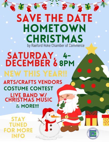 Come out for the Hometown Christmas on Main Street in Raeford! On Saturday, December 6, 4pm-8pm, Main Street will come alive with holiday cheer, featuring a new arts & crafts vendor market, live Christmas music and a festive costume contest. Elijah McCormick and his band will be performing! All your favorites will be returning like school performances, photos with Santa and Mrs. Claus, the tree lighting, train rides and more. Come shop, sip coco, and celebrate the season.