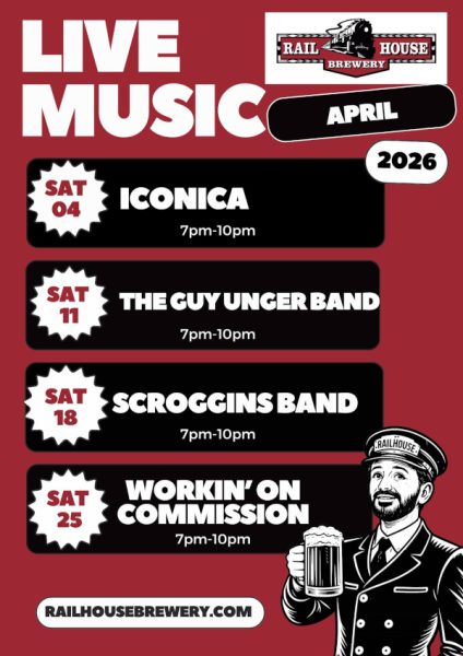 April is stacked with live music at Railhouse Brewery! Saturday nights, cold beer, and a solid lineup all month long — plus a few special events sprinkled in for good measure. Grab a pint, grab a seat, and make Railhouse your go-to stop this March! Live music runs 7PM-10PM.