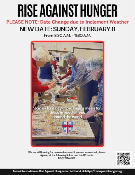 Emmanuel Episcopal Church is again partnering with Rise Against Hunger, aiming to package over 20,000 meals to support nutrition, education, and health for children and families facing hunger right now around the world. We are excited to celebrate together as we cross over 100,000 meals packaged together! Come together and volunteer on Sunday, February 8th from 8:30am-11:30am. Register and donate through the event website link provided below.