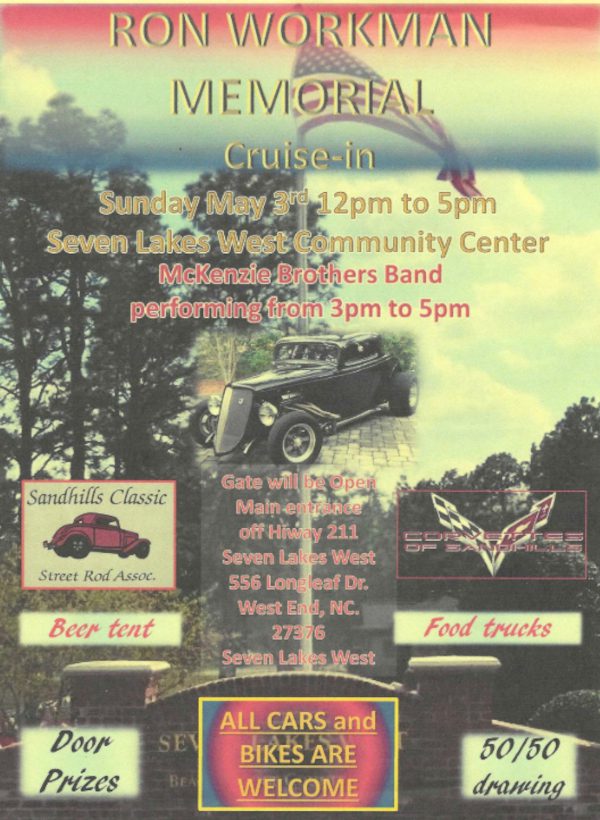 The Ron Workman Memorial Cruise-in is scheduled for Sunday, May 3rd, from 12:00PM-5:00PM at the Seven Lakes West Community Center. All cars and bikes are welcome to join this community gathering, which features a beer tent, food trucks, door prizes, and a 50/50 drawing. Enjoy live music from the McKenzie Brothers Band performing from 3:00PM-5:00PM. The event entrance is located off Highway 211 at 556 Longleaf Drive in West End, and it is hosted in collaboration with the Sandhills Classic Street Rod Association and Corvettes of Sandhills.
