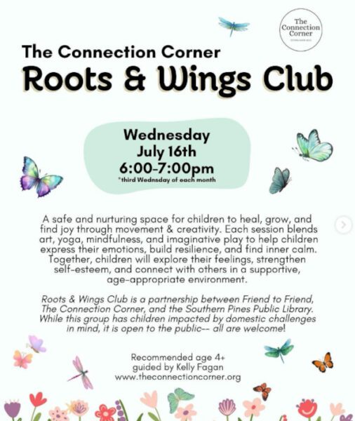 Join Friend to Friend’s Community Support Group at the Southern Pines Library, led by their licensed therapist. During the session, The Connection Corner will offer the Roots & Wings Club, a free art and yoga group for kids, giving caretakers a chance to connect while children enjoy a fun, creative space. Open to the public, with a special focus on families impacted by domestic challenges. Free to those who attend both groups. Roots & Wings Club and the Friend to Friend’s Community Support Group take place on the third Wednesday of each month from 6:00pm-7:00pm. Roots & Wings Club meets at the Connection Corner in Southern Pines. Friend to Friend’s Community Support Group is held at the Southern Pines Public Library.