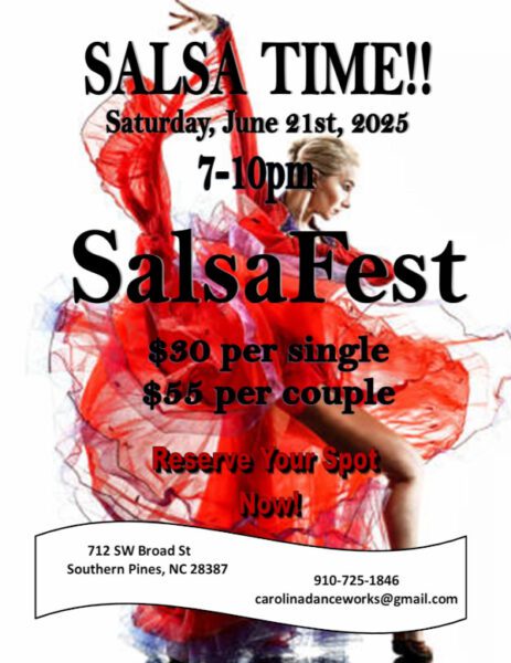 Join Carolina DanceWorks for a Salsa Dance Party on Saturday, June 21st | 7pm-10pm! Enjoy three hours of dancing, fabulous fun for all ages and a free group class. Enjoy Miss Debby’s delicious Taco Bar and two free drinks. For additional details and to register, call 910-725-1846.