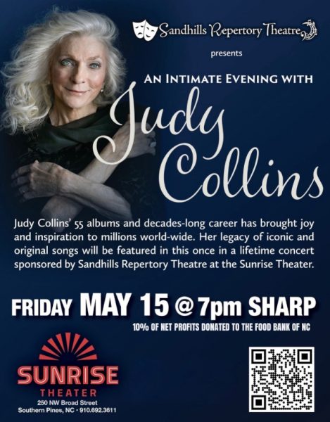 The Sandhills Repertory Theater and Sunrise Theater are pleased to present a once-in-a-lifetime event- An Intimate Evening with Judy Collins – LIVE! Join Ms. Collins for an evening on unforgettable songs and stories, up close and personal, on Friday, May 15th at 7:00pm!
