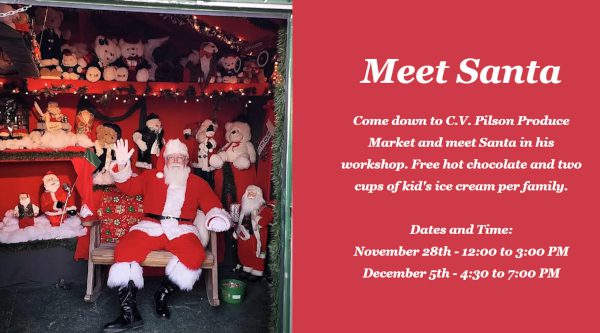 Come down to C.V. Pilson Produce Market in Sanford and meet Santa in his workshop! You can enjoy free hot chocolate and get two cups of kid’s ice cream per family. Be sure to bring your camer. The first opportunity to meet Santa is on Friday, November 28th from 12:00pm-3:00pm. Your second chance to visit is on December 5th from 4:30pm-7:00pm.