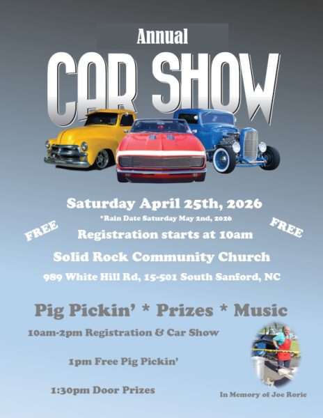 Solid Rock Community Church is hosting its Annual Car Show in memory of Joe Rorie on Saturday, April 25th, from 10:00AM-2:00PM. Located at 989 White Hill Road in South Sanford, this free event features a variety of classic cars, live bluegrass music, and exciting door prizes starting at 1:30PM. Attendees can also enjoy a free pig pickin’ lunch beginning at 1:00PM. Registration for car participants opens at 10:00AM on the day of the show, and a rain date is scheduled for Saturday, May 2nd.