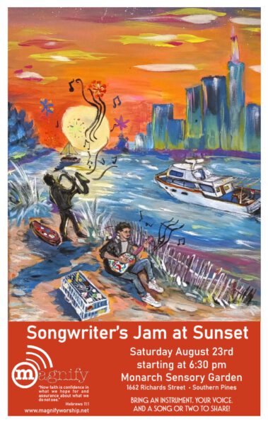 Enjoy an evening of live music and creativity at Songwriter’s Jam at Sunset on Saturday, August 23rd at 6:30pm in the Monarch Sensory Garden, 1662 Richards Street in Southern Pines. Bring your instrument, your voice and a song or two to share as local musicians gather for an inspiring night under the sunset. For more information email bob@magnifyworship.net. Hosted by Magnify Worship.