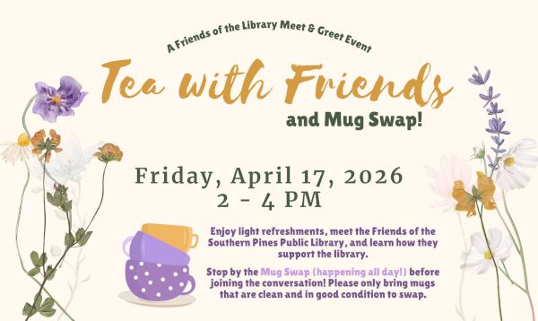 Curious about how the Friends of the Library support programs, events, and more? Thinking about joining? Come chat with the Southern Pines Public Library at Tea with Friends on Friday, April 17th, 2PM-4PM. Enjoy light refreshments, meet the Friends of the Library, and learn how you can get involved.
