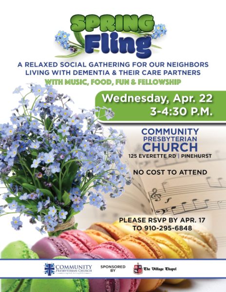 Community Presbyterian Church and The Village Chapel are co-sponsoring the “Spring Fling,” a relaxed social gathering specifically designed for neighbors living with dementia and their care partners. This community event will be held on Wednesday, April 22nd, from 3:00PM-4:30 at the Community Presbyterian Church in Pinehurst. Attendees can expect an afternoon of music, food, fun, and fellowship at no cost to attend. To ensure a spot at this gathering, please RSVP by Friday, April 17th by calling 910-295-6848.