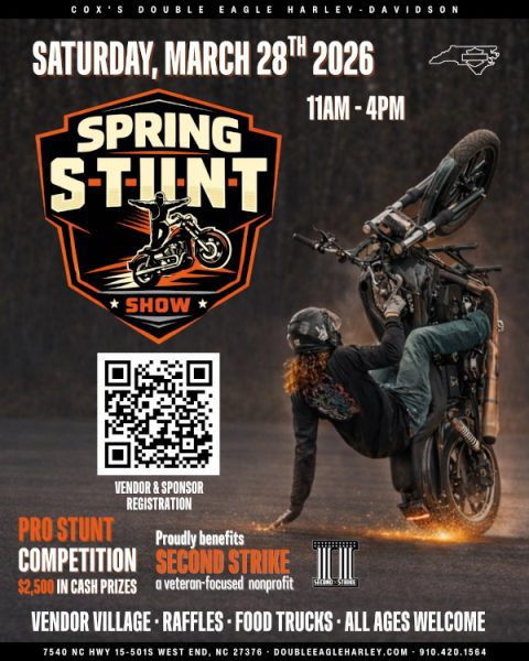 Get ready for the Spring Stunt Show at Cox’s Double Eagle Harley-Davidson on Saturday, March 28th | 11am-4pm. This action-packed event features a Pro Stunt Competition with $2,500 in cash prizes, a vendor village, raffles, and food trucks. All ages are welcome to attend this exciting day that proudly benefits Second Strike, a veteran-focused nonprofit. You can find more information or register as a vendor or sponsor at doubleeagleharley.com.