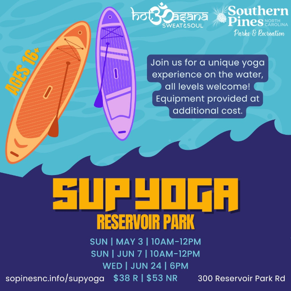 Southern Pines Parks & Recreation is partnering with Hot Asana Sweat & Soul to offer a unique yoga experience on the water at Reservoir Park. These Stand Up Paddleboard (SUP) Yoga sessions are open to all skill levels, providing a peaceful way to practice balance and mindfulness while enjoying the natural surroundings of the lake.
