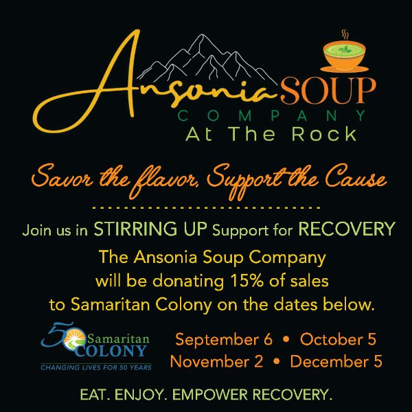 Join the Ansonia Soup Company at The Rock this Sunday, October 5th from 10am-3pm as they help a great cause! The Ansonia Soup Company is “Stirring up Support for Recovery!” and will be donating 15% of the day’s sales to Samaritan Colony, an organization that has been changing lives for 50 years. Samaritan Colony is a Non-Profit Residential Treatment Center for substance use disorders in Rockingham. Savor the flavor and support the cause. Eat. Enjoy. Empower Recovery.