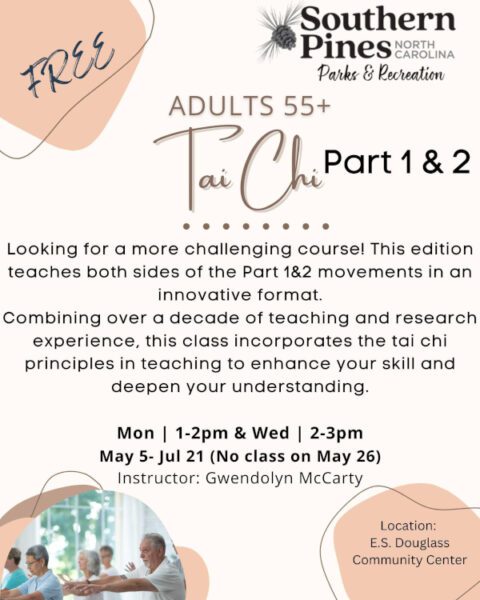 Adults 55+ are invited to attend free Tai Chi sessions with the Southern Pines Parks and Recreation Department! Tai Chi will improve your balance both mentally and physically. This can reduce the rate of falls in older adults. Improve relaxation, vitality, posture and your immunity. Sessions are held Mondays 1pm-2pm and Wednesdays 2pm-3pm through July 21st. For full details and registration, follow the link provided below.