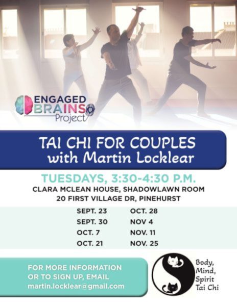 Connect, move, and relax together at Tai Chi for Couples with Martin Locklear, part of the Engaged Brains Project. Classes take place Tuesdays from 3:30pm-4:30pm at Clara McLean House in Pinehurst. Upcoming sessions include October 7th, 21st, and 28th; and November 4th, 11th, and 25th. For more information or to sign up, email martin.locklear@gmail.com.