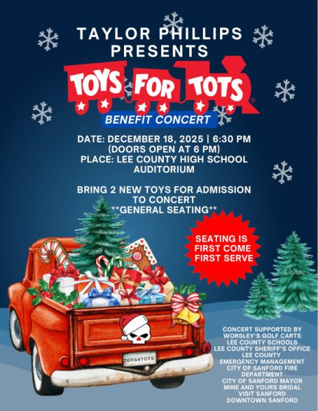 Taylor Phillips presents a Toys for Tots Benefit Concert on Thursday, December 18, 2025, at the Lee County High School Auditorium. Doors open at 6:00 PM with the concert beginning at 6:30 PM. Admission to the event is granted by bringing two new toys to donate. Please note that seating is general and available on a first-come, first-served basis.