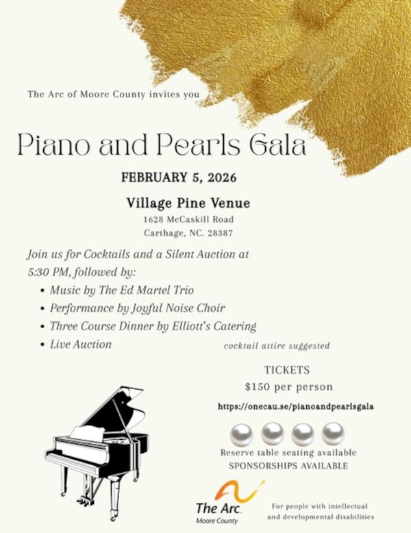 The Arc of Moore County cordially invites you to the Piano and Pearls Gala on Thursday, February 5th, 2026, at the Village Pine Venue, located at 1628 McCaskill Road in Carthage.