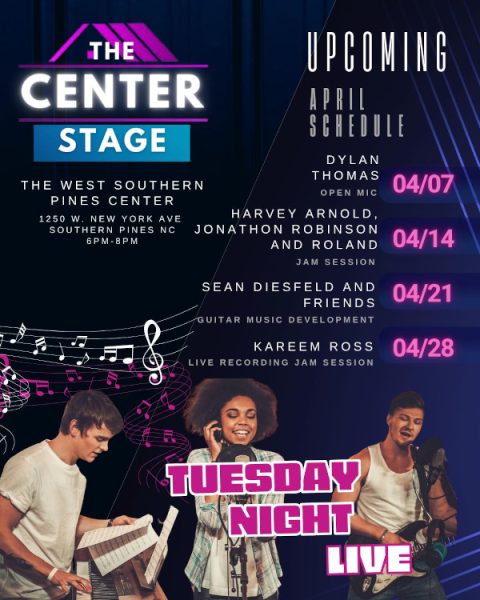 The West Southern Pines Center invites the community to Tuesday Night Live at The Center Stage located at 1250 W. New York Ave in Southern Pines. Each event runs from 6PM-8PM throughout the month of April and features a diverse lineup of musical performances and interactive sessions. Attendees can enjoy everything from open mic nights and jam sessions to specialized guitar music development and live recording experiences.