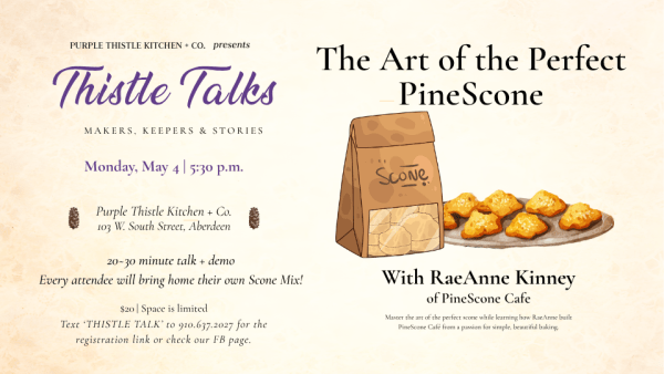 Mark your calendar for Monday, May 4th and join at Purple Thistle Kitchen & Co. for a cozy, hands-on PineScone Demo! Learn how to make perfectly tender, bakery-style scones using PineScone Café’s signature mixes—simple, approachable, and absolutely delicious. Whether you’re a seasoned baker or just getting started, this is a fun way to build confidence in the kitchen. Each participant will head home with their own PineScone mix (in the flavor of your choice!) so you can recreate the magic in your own kitchen. This is a ticketed event and space is limited. The cost is $20. Register through the event website link provided below.