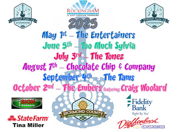 Come out to Thursday Plaza Jam in Rockingham! Thursday Plaza Jam is a free concert series that takes place the first Thursday of each month, May-October. Concerts are held on Cole Plaza, 6:30pm-8:30pm. This is a free and family-friendly event. There will be a food truck on site for the fun. Please bring a chair or blanket for your own comfort.