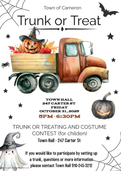 Join the Town of Cameron for a super fun and spooky Trunk or Treating & Costume Contest for children on Friday, October 31st | 5:00pm-6:30pm!