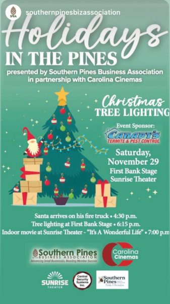 The Town of Southern Pines will hold the annual Christmas Tree Lighting on Saturday, November 29th | 4:30pm-6:30pm! Enjoy the festivities to ring in the Holidays at the First Bank Stage and green space at Sunrise Theater ! Santa will arrive by fire engine at 4:30pm, and he will be available to visit and take photographs with children until 6:15pm. Be sure to bring your own camera. There will be evening entertainment after the tree lighting at 6:15pm. Limited concessions will be available.