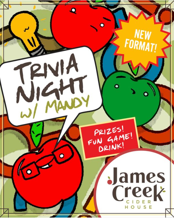 Grab your smartest friends (or your most competitive ones), build your team, and make Wednesday nights at James Creek your new tradition. Trivia Night takes place each Wednesday at 7PM. Let’s see who really runs the orchard.
