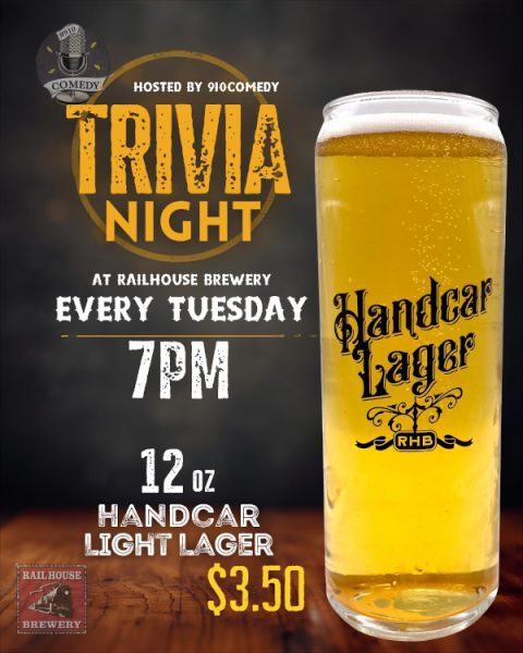 Hosted by the crew from 910 Comedy. Bring a team or make friends when you get here. Bragging rights (and prizes) are on the line. And because thinking is hard work…$3.50 Handcar Light Lager. Grab a table, grab a pint, and get ready to yell “WE KNEW THAT!” across the brewery.