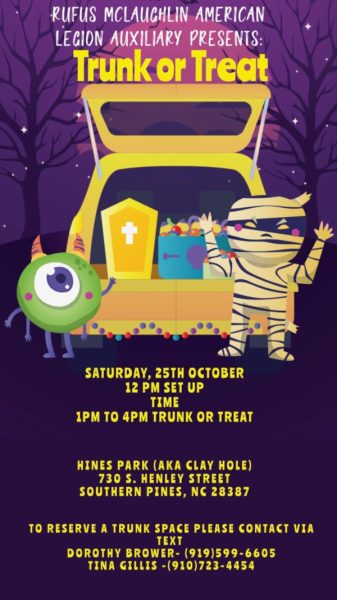The Rufus McLaughlin American Legion Auxiliary invites your family to a fun, safe Trunk or Treat event this Halloween season on Saturday, October 25th, at Hines Park (aka Clay Hole), located at 730 S. Henley Street in Southern Pines. Bring the children out with costumes, treats and family-friendly fun!The Trunk or Treat itself runs from 1:00pm-4:00pm. Trunk setup begins at 12:00pm.
