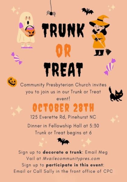 Community Presbyterian Church invites everyone to its Trunk or Treat event on Tuesday, October 28th. Dinner will be served in the Fellowship Hall at 5:30pm, and the Trunk or Treat activities will begin at 6:00pm. To sign up to decorate a trunk, please email Meg Vail at mvail@communitypres.com. To participate in the event, you can email or call Sally in the front office of CPC.