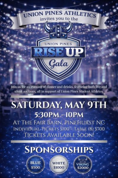 Union Pines Athletics invites you to the Rise Up Gala on Saturday, May 9th, from 5:30pm-10:00pm at The Fair Barn in Pinehurst! This special evening supports Union Pines student athletes and includes dinner, drinks, and both live and silent auctions. Individual tickets are priced at $100, while a table for eight can be purchased for $700, with all tickets becoming available soon. Sponsorship opportunities are also available at three distinct levels: Blue for $500, White for $1000, and Viking for $2000. More details and ticket information coming soon.