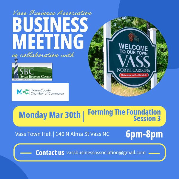 The Vass Business Association is hosting a business meeting in collaboration with the Sandhills Community College Small Business Center and the Moore County Chamber of Commerce on Monday, March 30th. This session, titled “Forming The Foundation Session 3,” will take place from 6:00PM-8:00PM at the Vass Town Hall.