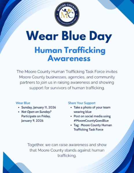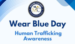 Moore County Goes Blue! Join the Moore County Human Trafficking Task Force in observing Wear Blue Day to raise awareness and support survivors on Sunday, January 11th. If your business or agency is not open on Sunday, you are encouraged to participate early on Friday, January 9, 2026.