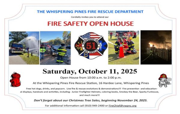 The Whispering Pines Fire Rescue Department invites the community to their free Fire Safety Open House on Saturday, October 11th | 10:00am–2:00pm at the Fire Rescue Station on Hardee Lane. Enjoy free hot dogs, drinks, and popcorn while exploring fire prevention displays, live fire and rescue demonstrations, and fun activities for kids including junior firefighter helmets, coloring books, Smokey the Bear, Sparky Funhouse, and more! Don’t miss this family-friendly day of learning and fun.