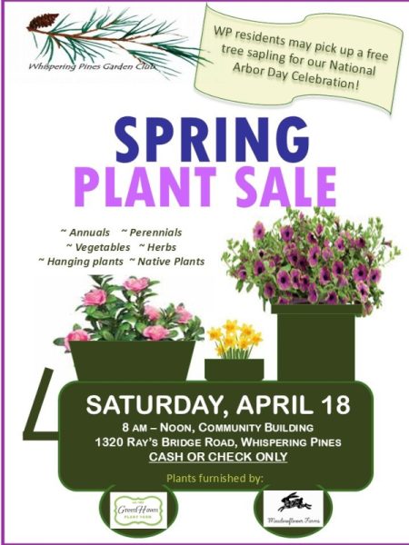The Whispering Pines Garden Club invites you to their Spring Plant Sale on Saturday, April 18th, from 8AM-12PM at the Community Building located at 1320 Ray’s Bridge Road. You will find a beautiful variety of annuals, perennials, vegetables, herbs, hanging plants, and native plants furnished by Green Haven Plant Farm and Meadowflower Farms.